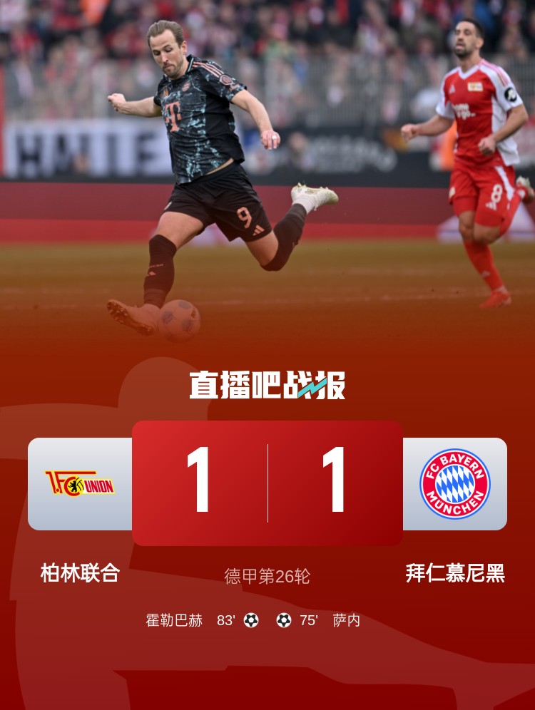 德甲第26輪,拜仁客場1-1柏林聯(lián)合,薩內替補建功,烏爾比希失誤。