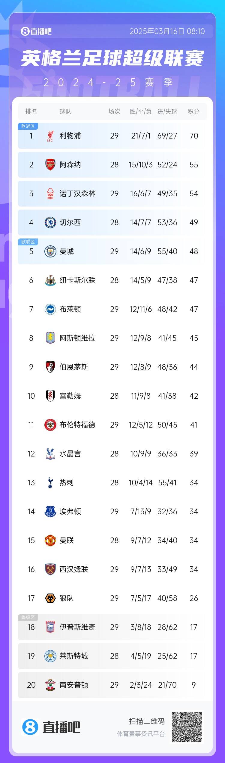 03月16日訊 英超第29輪比賽多場戰罷,狼隊2-1擊敗南安普頓拿下3分,現已領先降級區9分保級形勢大好。
