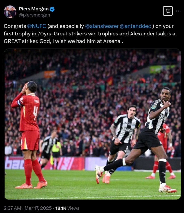 3月17日訊 本賽季聯賽杯決賽落幕,紐卡2-1擊敗利物浦捧杯,終結70年冠軍荒。賽后,知名槍迷、英國名嘴皮爾斯-摩根向紐卡送上祝賀。