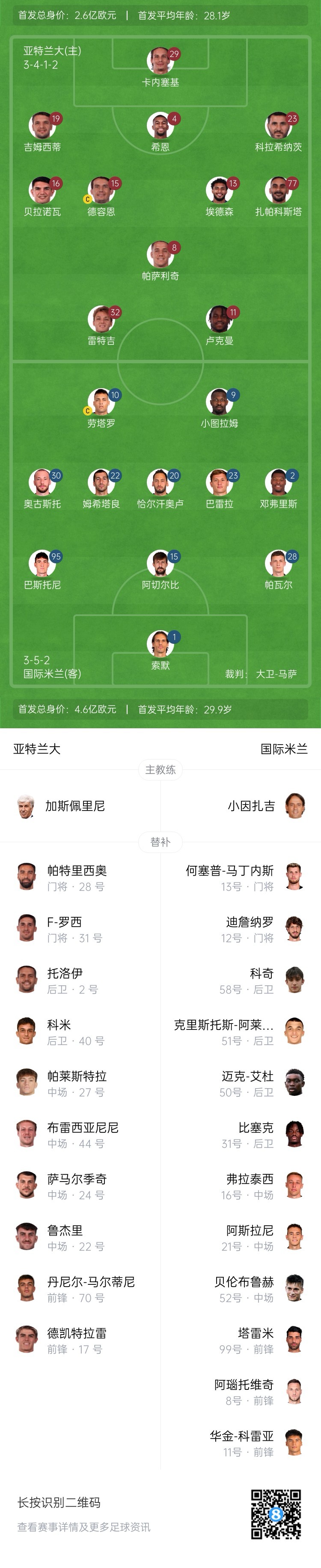 亞特蘭大替補(bǔ):28-帕特里西奧、31-F-羅西、2-托洛伊、17-德凱特拉雷、22-魯杰里、24-薩馬爾季奇、27-帕萊斯特拉、40-科米、44-布雷夏尼尼、70-丹尼爾-馬爾蒂尼