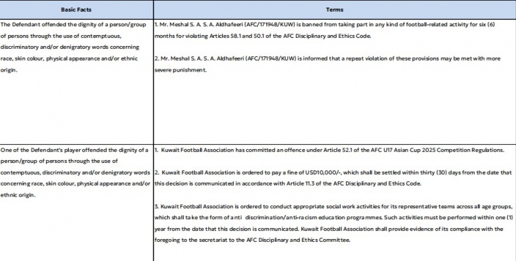 - 亞足聯(lián):科威特U17球員種族歧視行為被禁賽半年,足協(xié)罰款1萬美元